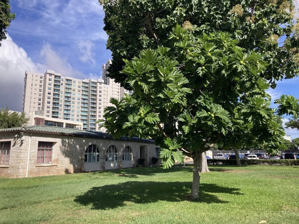 今回はワイキキの隣にある、アラモアナ地区のコンクリートジャングル内にひっそりと佇むハワイ古来のブレッドフルーツ(日本名「パンの実」、ハワイ語では「ウル」)の木についてお伝えします。