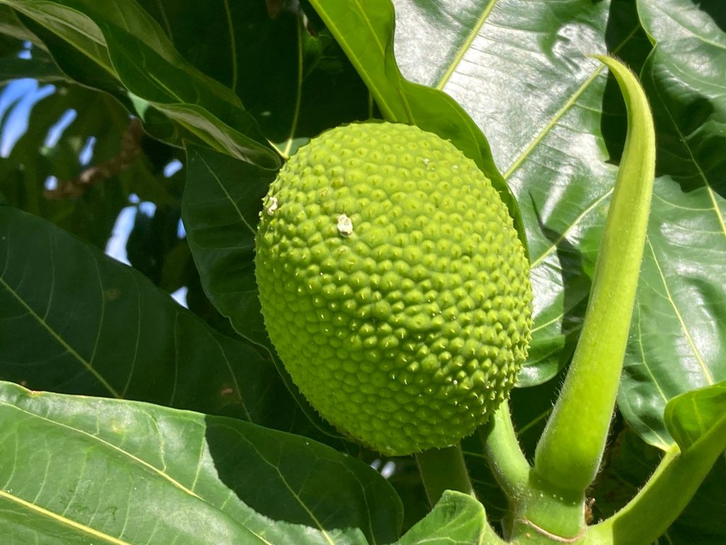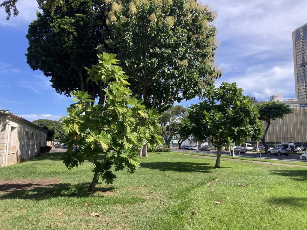 当時は膝下にも満たない高さの苗木でした。上司がどこかから寄贈され、それをハワイ古来の大切な植物なので農務省の敷地内に植樹しようということになりました。ちなみにブレッドフルーツは桑科の植物で、ポリネシアなど太平洋の熱帯・亜熱帯地域で古くから主食とされ、栄養価が高いことで知られています。その実は、蒸したり、焼いたり、揚げたりすることによりグルテンフリーの主食となります。蒸したものは味がパンに近いと言われますが、私感ではむしろサツマイモに近い味だと思います。