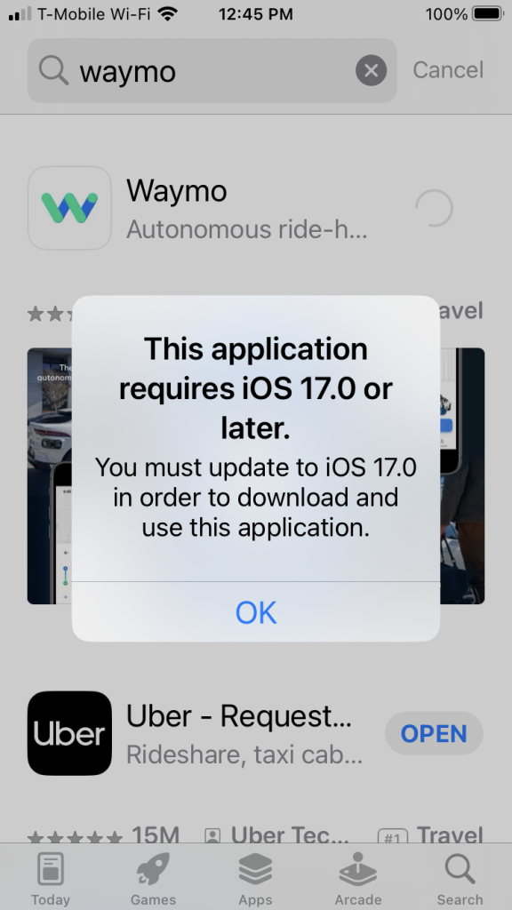 興味本位で乗車してみたいと思い、自分のiPhoneにWaymoのアプリをダウンロードしようと試みましたが、5年前のiPhoneだとOSが古すぎるとのことで出来ませんでした(涙)。
