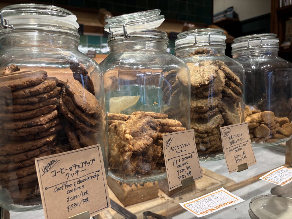 1枚280円から買えるヴィーガンクッキーも、甘さの塩梅がよく、いちじく&ココナッツ、コーヒー&チョコチップ、紅茶&アーモンド&柑橘ピールと、どれも素材のおいしさの生きた、サクサクとした口当たりが心地よく美味しいクッキーです。