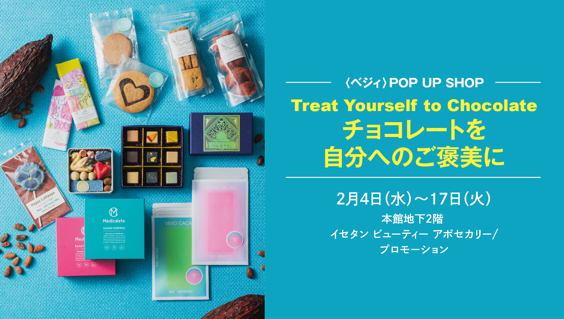 今回は、第1弾としてイセタン ビューティー アポセカリーセレクションが4日からスタート、そして第2弾としてveggyセレクションブランドが9日からスタートする二段構えの構成でお届け。POP UP SHOP期間限定で販売するブランドから、人気ブランドの新作チョコレートやビューティアポセカリーの定番チョコレートに出会うべく、ぜひ会場に足を運んでみてください。