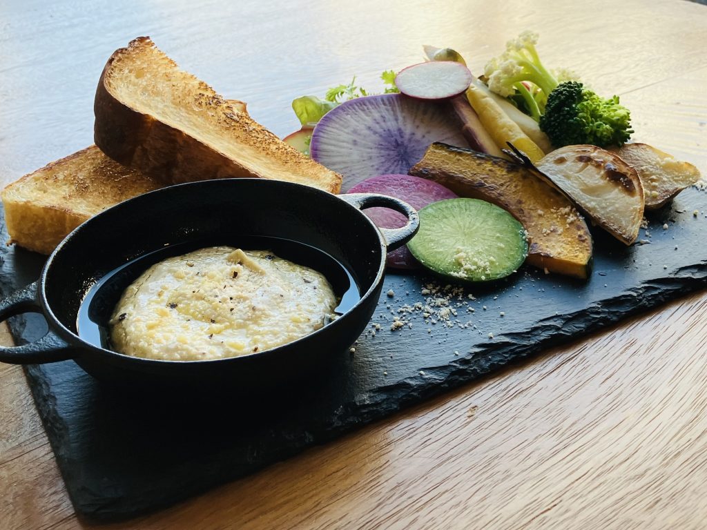 看板メニューの一つが、旬の野菜と天然酵母の自家製パンを味わえる「有機野菜のバーニャカウダ」です。