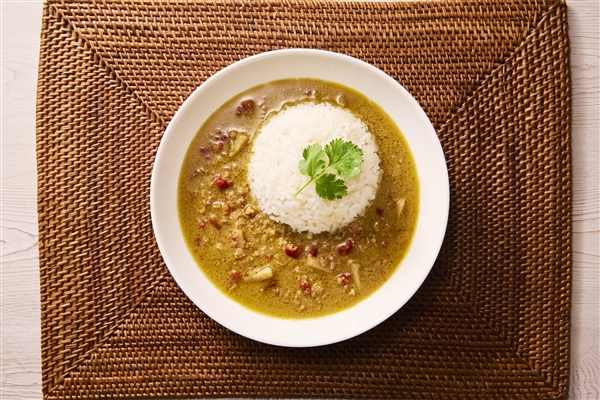 大豆ミートを使用したグリーンカレーは、ココナッツミルクのまろやかな甘さに、爽やかなハーブやライムの香りが重なり、野菜の旨みとスパイシーな味わいが後を引く一品。