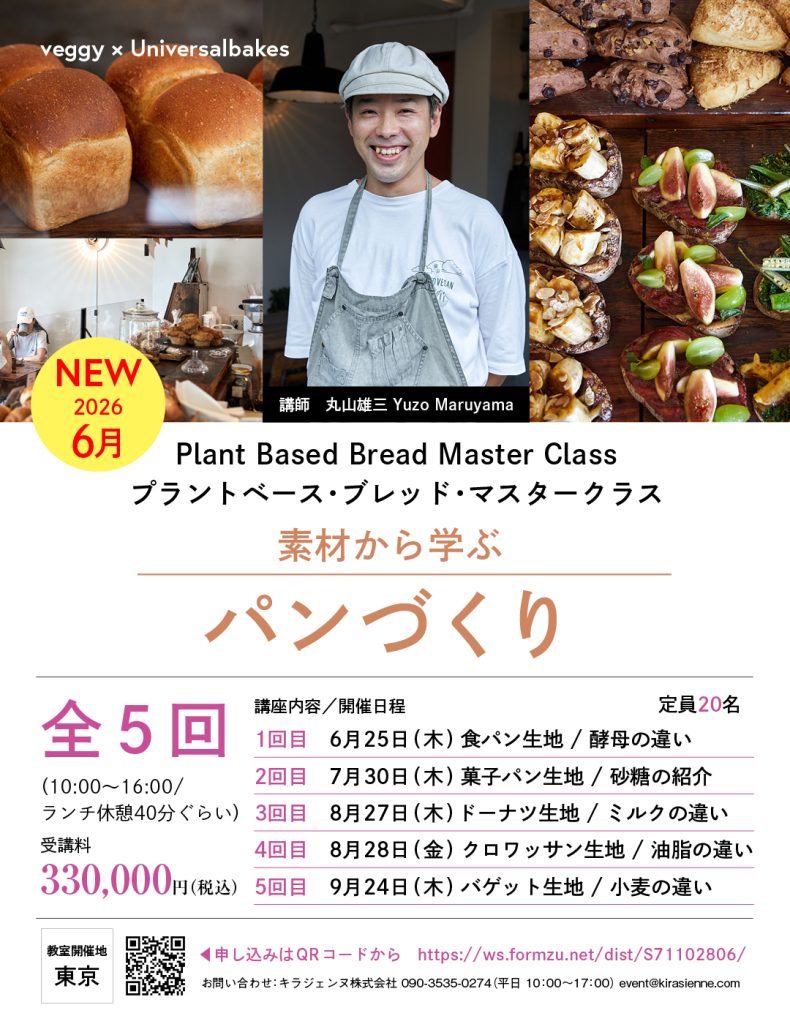 日本でNo.1のプラントベースパン屋さんである世界が認めるUniversal Bakes and Cafeとveggyによる唯一無二のスペシャルコラボ講座です。レシピには書ききれない“素材の力”を、ぜひこの講座でリアルに体感して学んでいきましょう。
